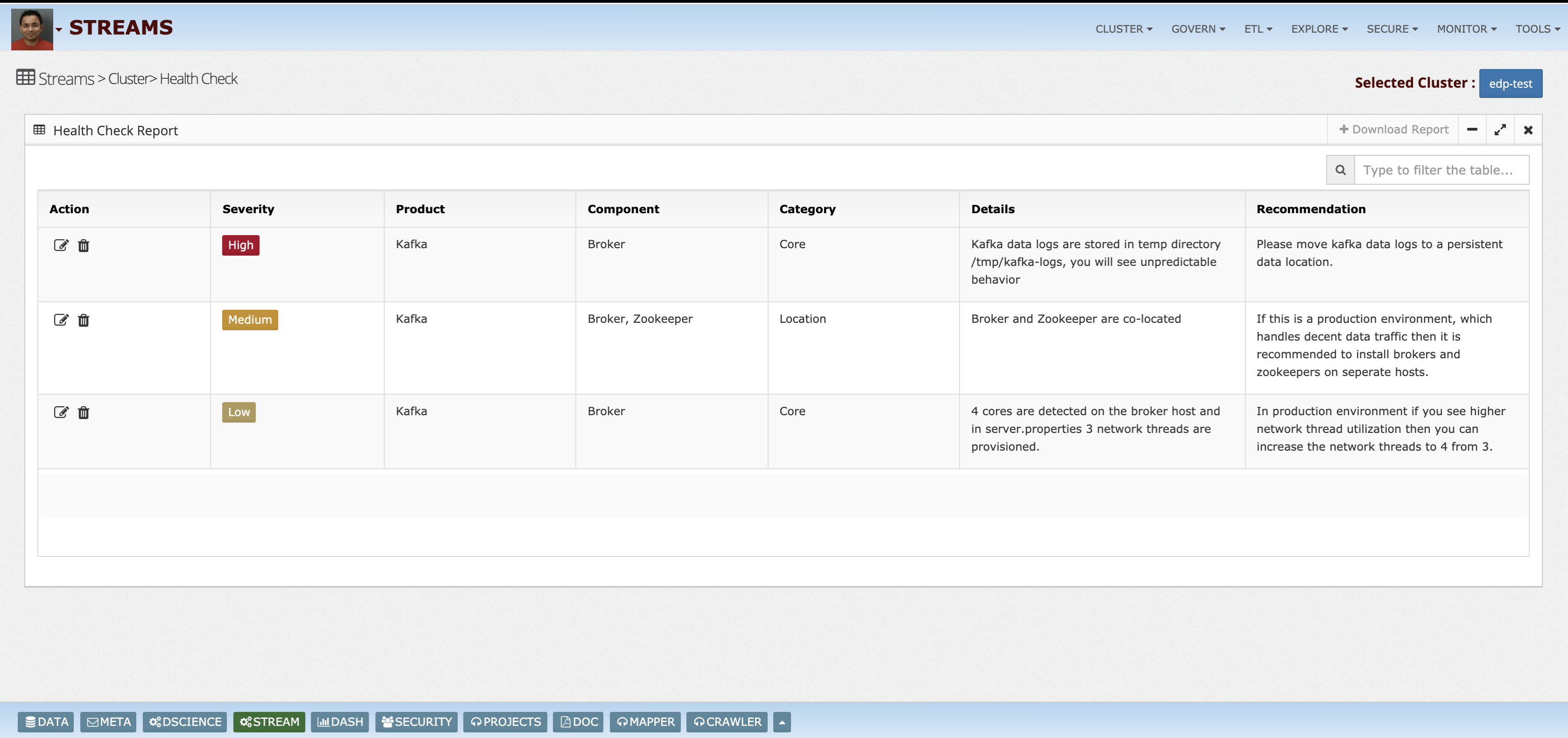 Health checks can be performed on the cluster and complete report can be viewed or downloaded from the console. Report includes important suggestions in terms of priority.